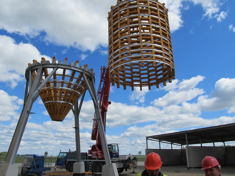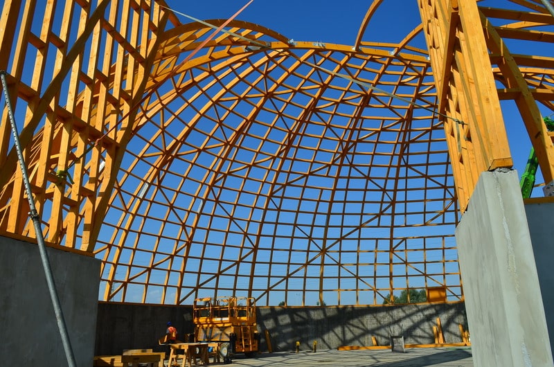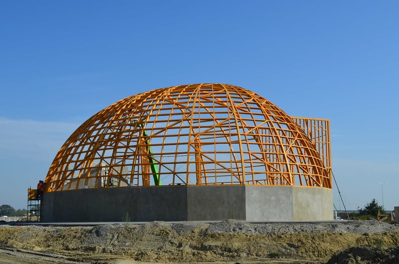 Istotą konstrukcji jest drewniany – wykonany z prefabrykowanych paneli – dach w kształcie kopuły, który jest posadowiony na żelbetowej ścianie oporowej w kształcie pierścienia. Zastosowana technologia oraz zestaw specjalistycznych urządzeń zapewniają nadzwyczaj szybki montaż budynku
