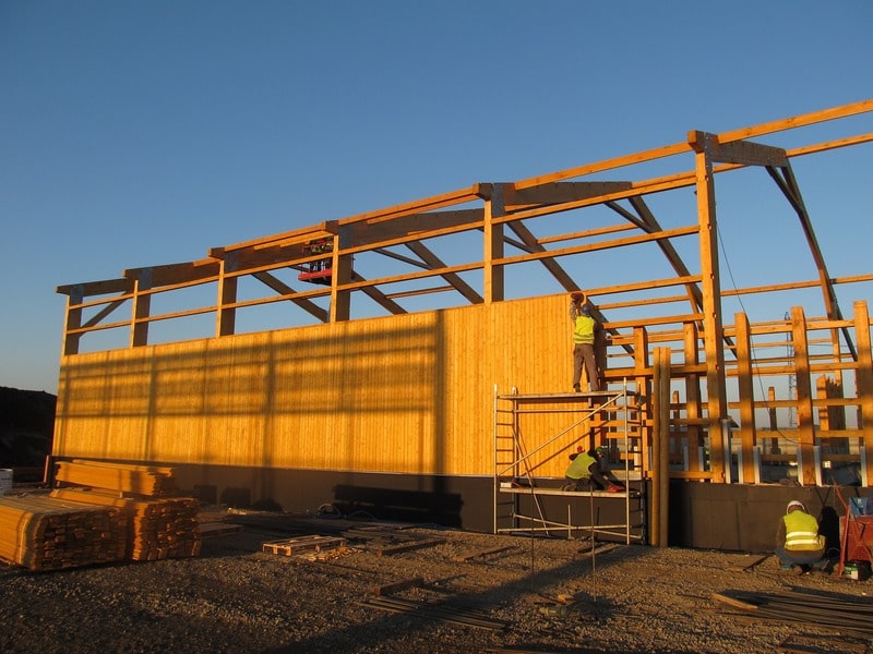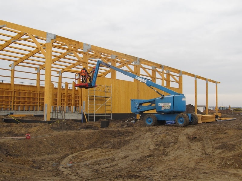 – Konstrukcja magazynu wykonana z drewna klejonego oraz konstrukcyjnego z zewnętrznym poszyciem z deski impregnowanej – boazerii.